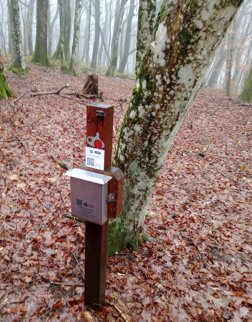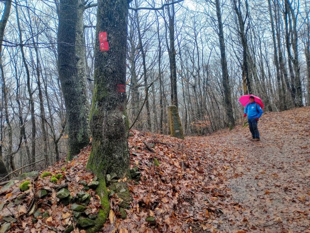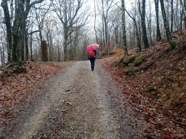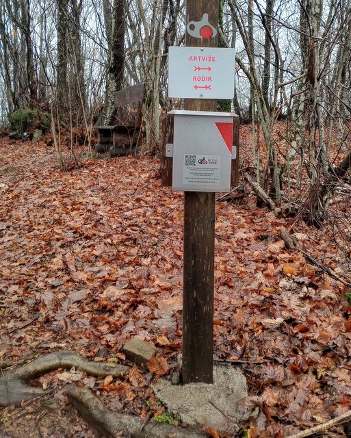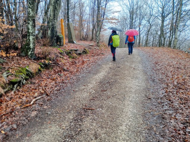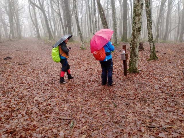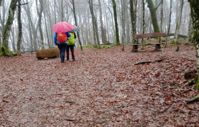 Po napovedih, naj bi ob 9:15 dež prenehal, vendar so nas vremenarji nategnili. Sicer naliva ni bilo, je pa cel čas zmerno rosilo. Tako smo se z dežniki sprehodili zanimivi poti Parka Rodik.