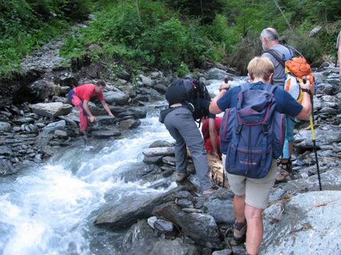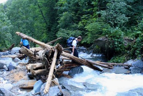 Naša dva lokalna vodiča improvizirata prehod čez reko