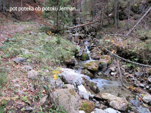 poti, ki poteka ob potoku Jerman, odpravimo, mimo lovske koče v Železnici  (1635 m),