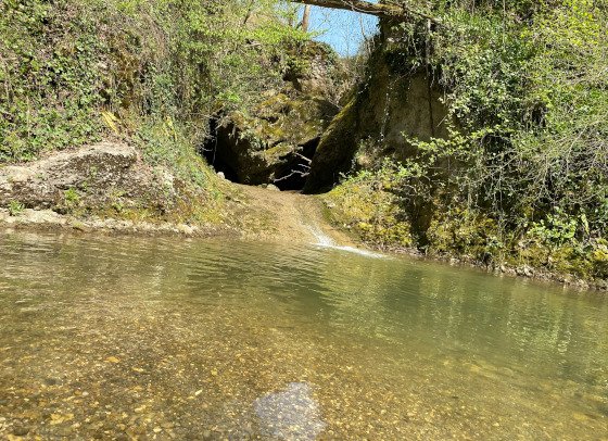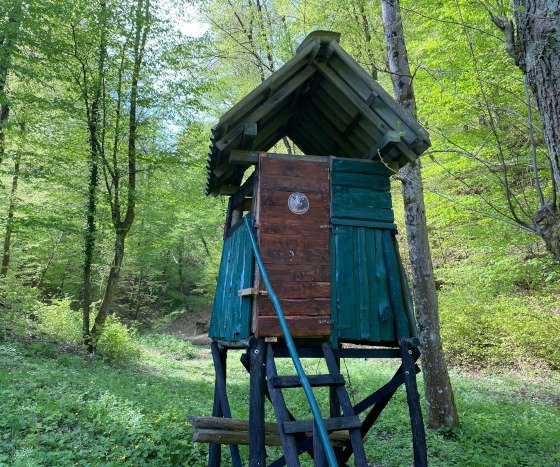 se skriva v gozdu in najprej smo prišli do zavetišča z gobarji, ki so že nabirali prve