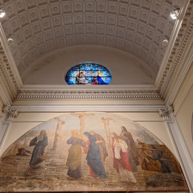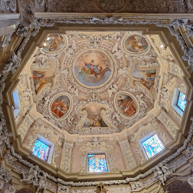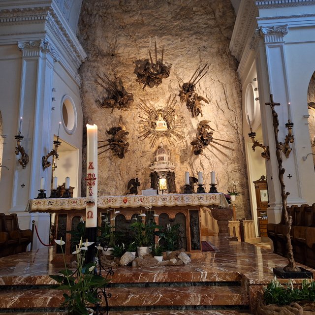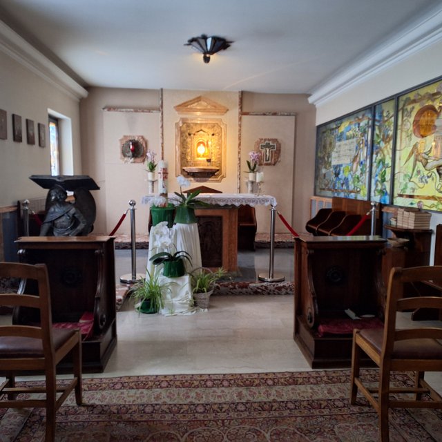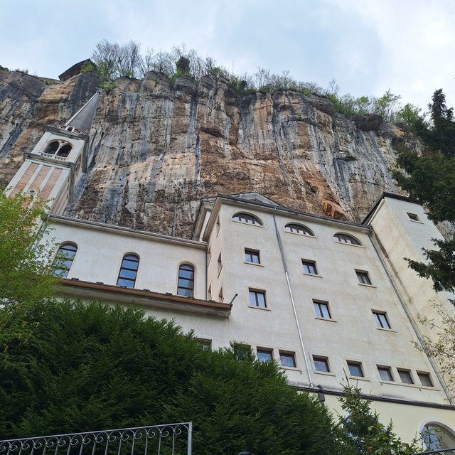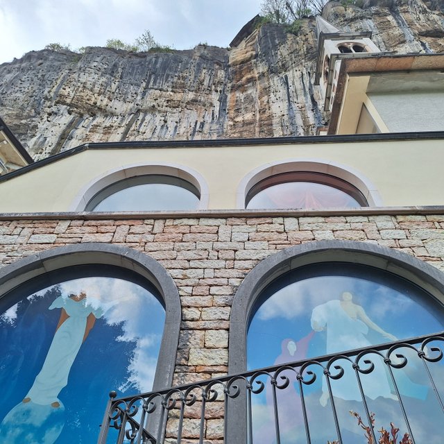 zgrajena na prepadni polici, vendar pa je nadstropna, polna umetniških nabožnih del,