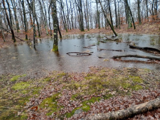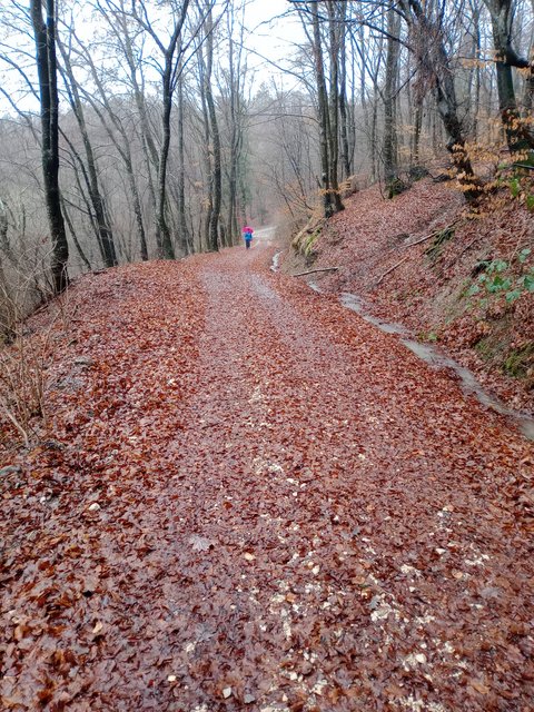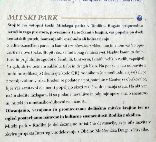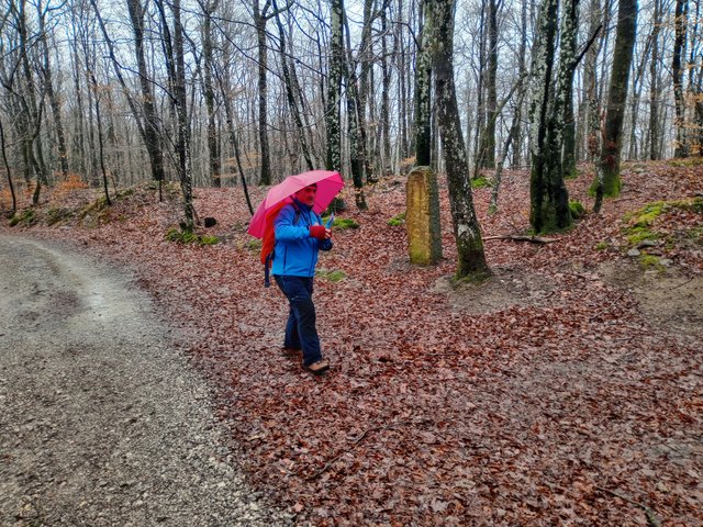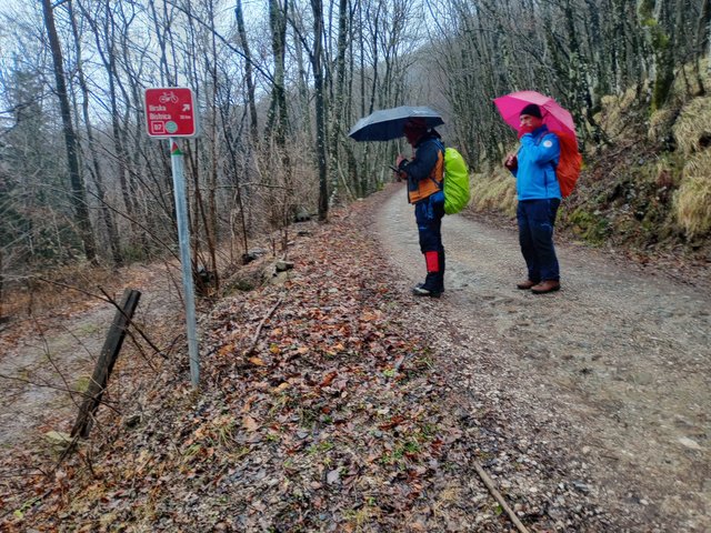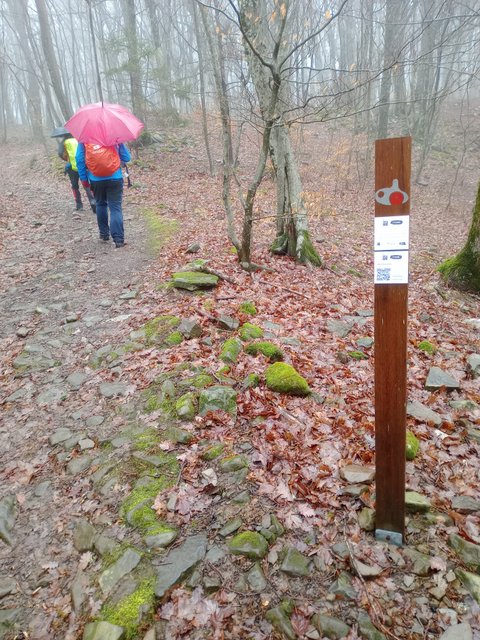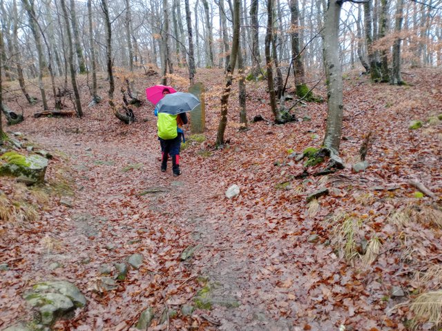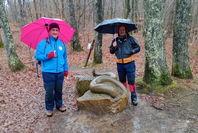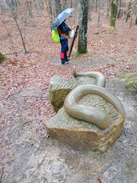 Po napovedih, naj bi ob 9:15 dež prenehal, vendar so nas vremenarji nategnili. Sicer naliva ni bilo, je pa cel čas zmerno rosilo. Tako smo se z dežniki sprehodili zanimivi poti Parka Rodik.