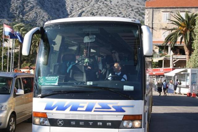 Naš prvi avtobus, ki ga vozi Renato, se odpravlja na trajekt.