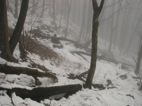 Megla,veter s sunki 70 do 80 km/h na vrhu,padajoče veje,podrena debla