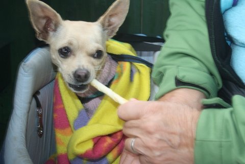 Megi je kar prijetno, saj je večino pohoda preživela v varnem zavetju.