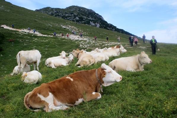 Kravice uživajo na mehki travi med zlaticami in radovedno opazujejo množico pohodnikov, ki hodijo mimo njih proti vrhu in nazaj ...
