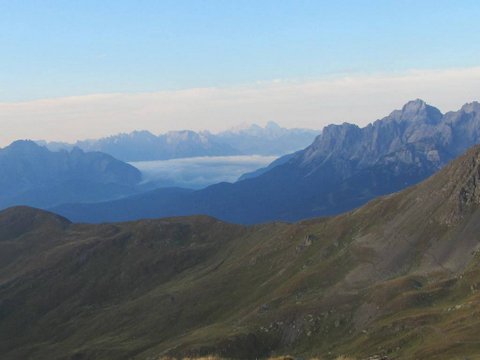 vrha gote Monte Cavallino/Cima Vanscuro, 2493 m med meglo in jasnino. Po mejnem