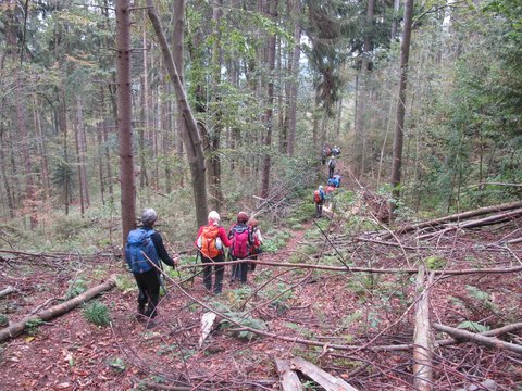 na viš. 763 m. Ves čas smo se morali prebijati skozi podrta drevesa in veje, ki