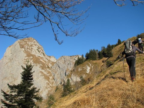 razpotja in po brezpotju po strmih travah do ozkega grebena.Na višini