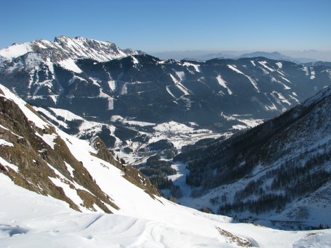 visok zid Eisenerzer Reichensteina okovan v sneg in led,na grebenu pa