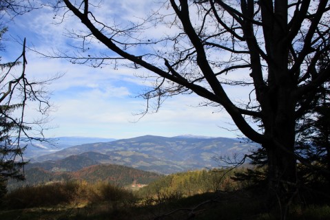 Na poti proti Kremžarjevem vrhu se odpre pogled na Koralpe in Svinško planino.