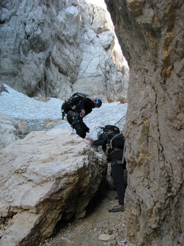 Tudi spust skozi ozebnik po vrvi,je bil pravo kirurško delo.Skalni