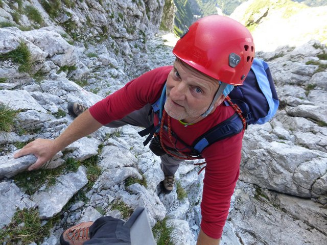Sledi prečenje pod stenami in okoli v grapo in po njej navzgor (II). Zadnji