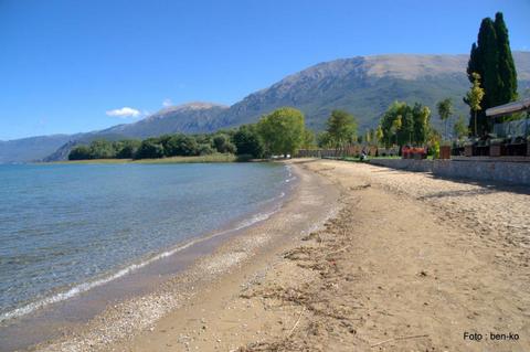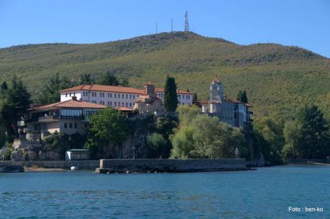 od Ohrida, tik nad albansko mejo, na visoki skali nad jezerom. Zaradi