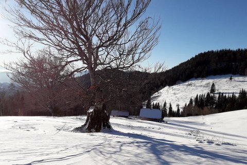 Travnikom nadanemo krplje in še bolj smelo zagrizemo v snežno idilo,ki nas