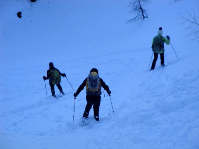 zasneženih grapah na planino Hintersteinalm in naprej na izhodišče.