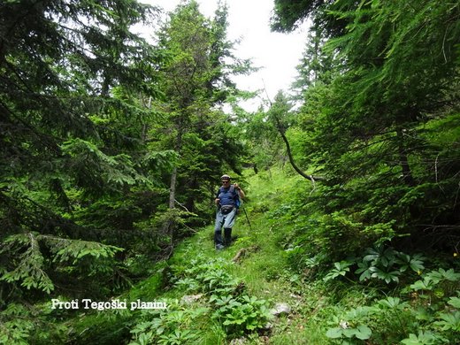 strmih grap, do Tegoške planine (1430 m) in naprej do izhodišča. Hoje je