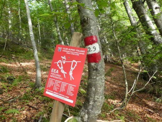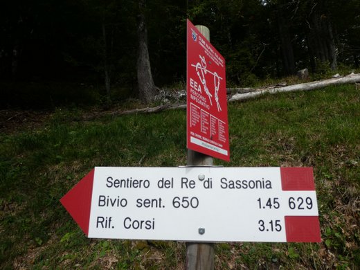 Začetek poti proti koči Corsi do odcepa za pot Saškega kralja. Po slednji poti prispeva do bivaka Bruner in nadaljujeva po nemarkirani poti na Vetto bello.