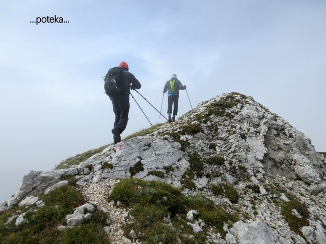 Konjsko sedlo. Nekaj pred sedlom smo zavili po strmem brezpotju na vrh Meje