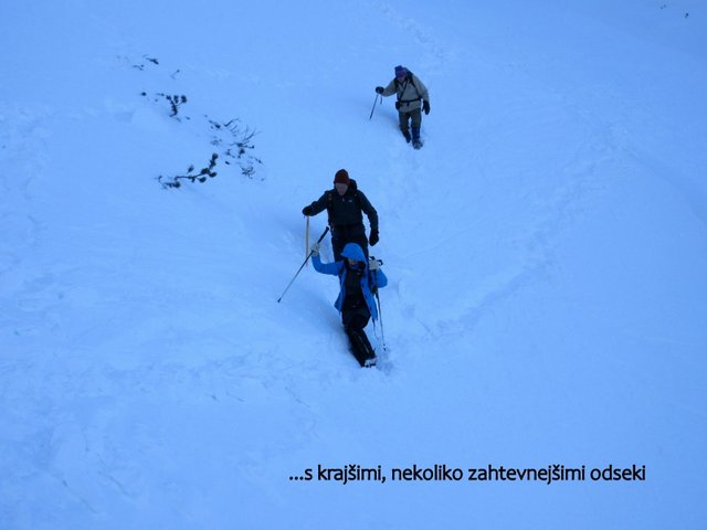urni hoji v kar zahtevnih razmerah. Sestopimo po poti vzpona, vendar se na
