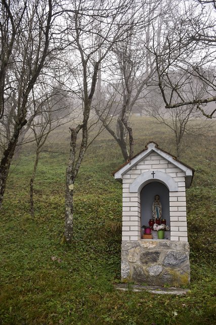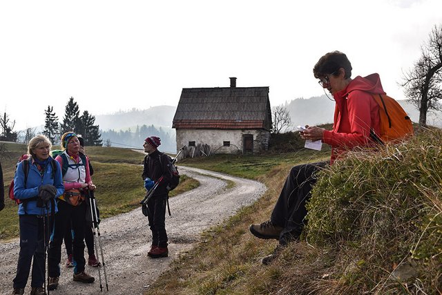 Naša pot se je začela pri Straži nad Spodnjo Idrijo, kjer smo prečili Otuško. V meglene strmali smo se podali do Črva, 280 m, Rovta, 360 m, do Grepiš, 480 m in mimo opuščenih domačij na Razorih, 660 m, in Ledinah, 700 m, na sedlo s spominsko kapelico na Jezeru, 705 m. Od tu na Galek, 831 m ni bilo daleč. Sestopili smo na Kališe, po vlaki v grapo Otuške in preko nje smo se ponovno povzpeli do Erjavca. Tu nam je Jerica prebrala nekaj grenkih zgodb iz časov II. svetovne vojne, ko je tu delovala partizanska bolnica. Po kolovozu nad Peklom smo sledili v Rupo in čez Stržnico v Jagršče, 658 m, do cerkve Svete Uršule, kjer se nam je pridružila ujeda.