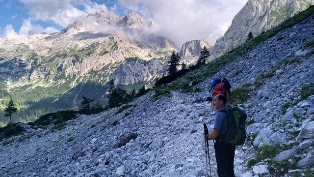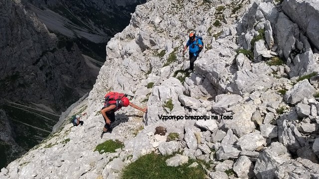 Vernar in sestopimo nazaj.Začnemo vzpon po brezpotju na Tosc.Po prvih