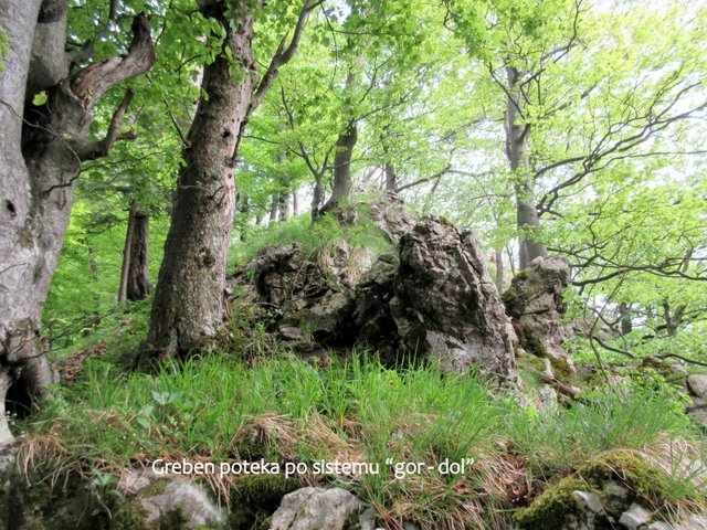 nekoliko lažja?). Pot po dokaj skalnatem grebenu poteka „gor – dol“ in ni