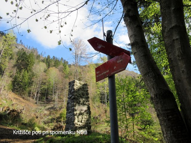 opuščeni planini Ston (1100 m). Mimo spomenika NOB in pod ostenjem Tirskih