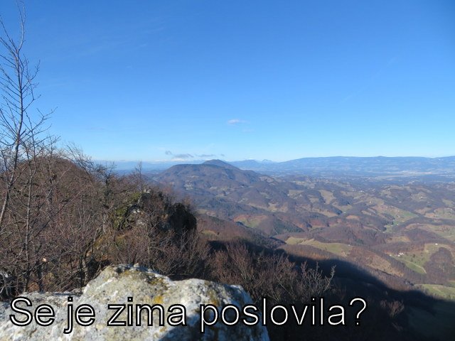 V ponedeljek še sneg,veter in megla,danes lep sončen,topel dan. Sneg je pobralo,pot na severni strani poledenela in blatna. V nekaj dnevih toliko različnih podob narave,da je vredno iti ven.