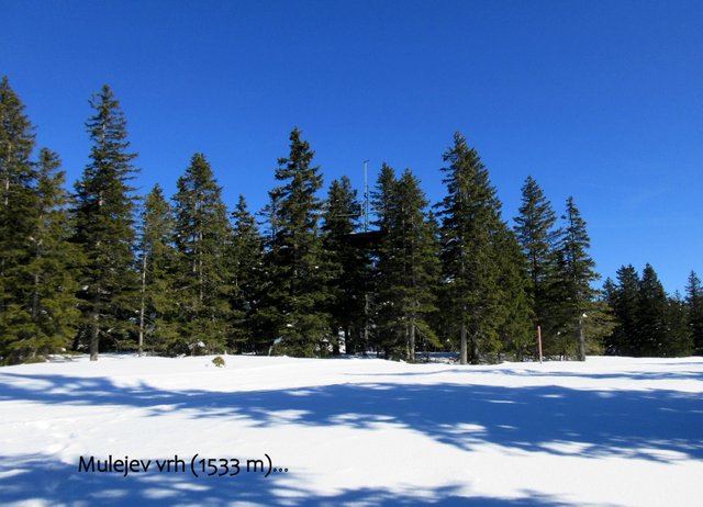Od Koče na Pesku (1386 m) se, mimo smučišča Mašin žaga, napotiva na Mulejev vrh
