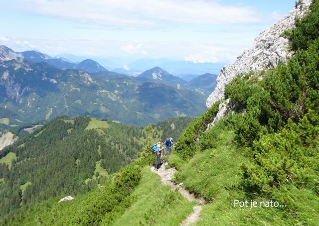 Košutico. Sestopimo po zahtevni pot na Hanjževo sedlo (1701 m), nato pa zavijemo