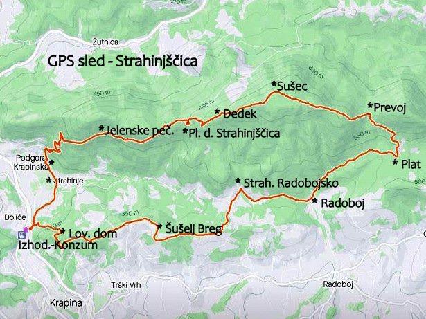 Krapina (198 m - KT - 1), potem na Šušelj Breg (350 m - KT - 2), nato pa je