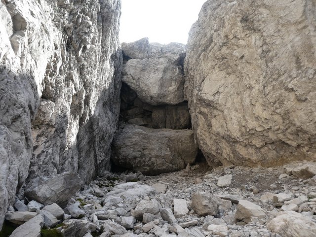 Tako krenemo sveži s koče in se čez 300 metrsko grapo prebijemo na sedlo