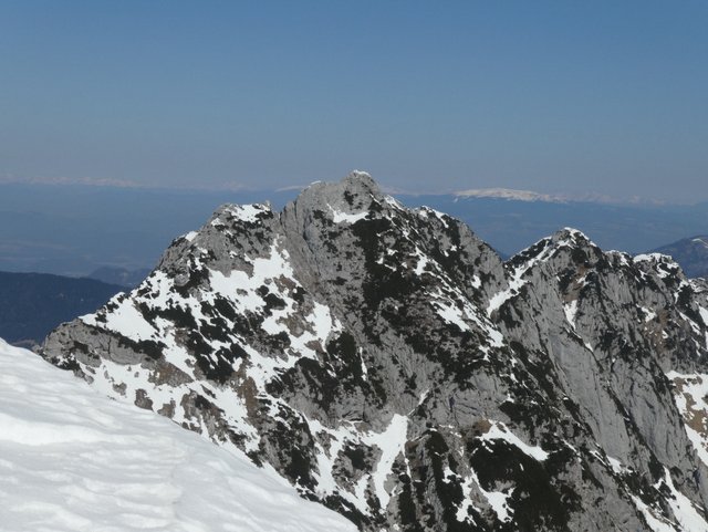 sam vrh. Vzpon je v teh razmerah zahteven. Z Ojstrice sestopiva proti