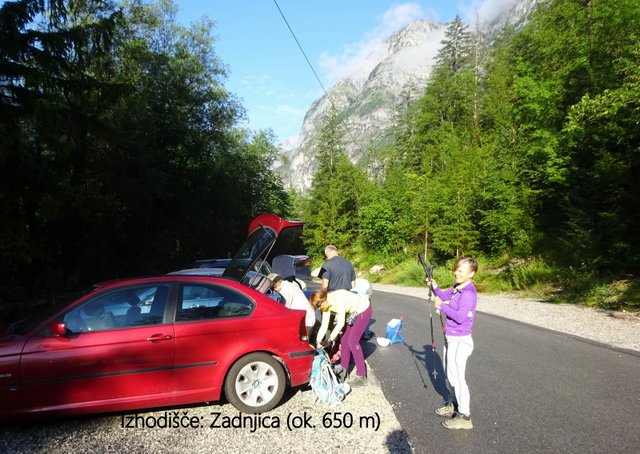 parkirišču (5 €) v dolini Zadnjice (ok. 650 m) v Trenti. Po markirani poti, ki pelje