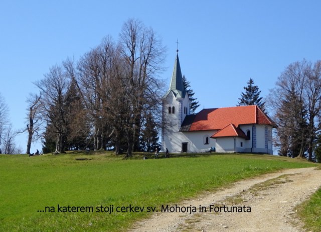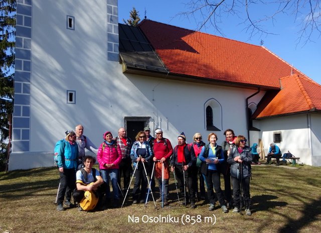 na vrh Osolnika (858 m), kjer stoji cerkev sv. Mohorja in Fortunata, nato pa po