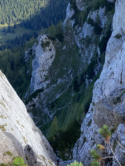 žlebu navzdol ni bil najbolj prijeten. Nekaj klinov in rdečih oznak je še v pomoč.