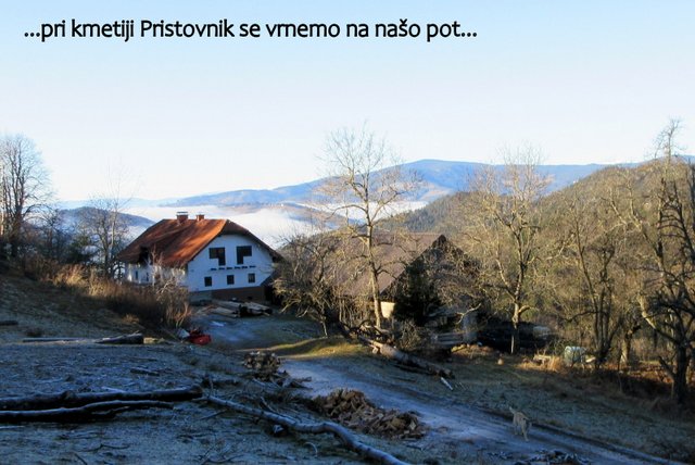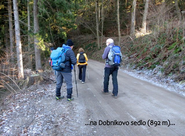 sestopimo do Dobnikovega sedla (892 m), nato pa po neoznačeni poti, mimo kmetij