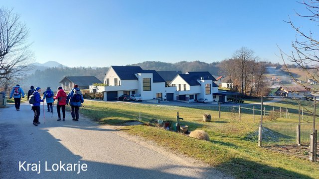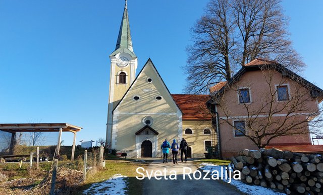 vrhu je lepo okrašena baročna cerkev. Pot je bila razgledna, hodili smo skozi vasi,