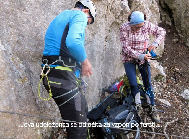 vstopa v zahtevno ferato "Boč" (zahtevnost C/D), kjer se dva udeleženca odločita, da jo