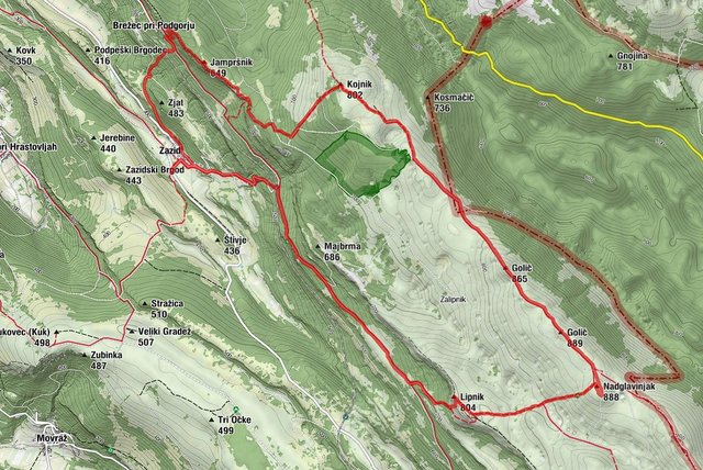 Lipnik (804 m),dalje na Nadglavinjak (888 m), potem dva vrhova Golič (889 m in 865 m)