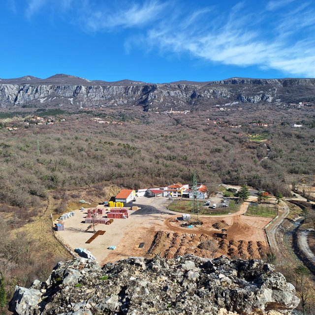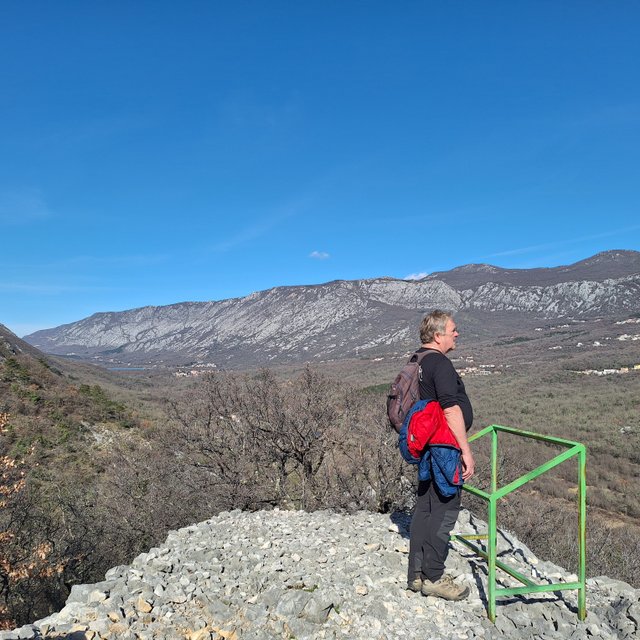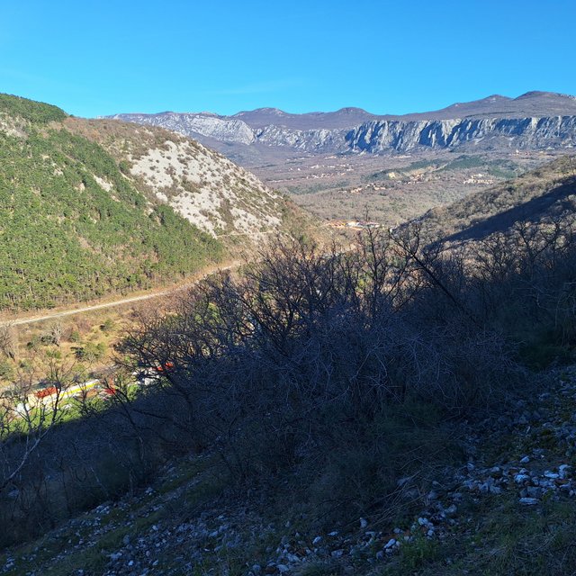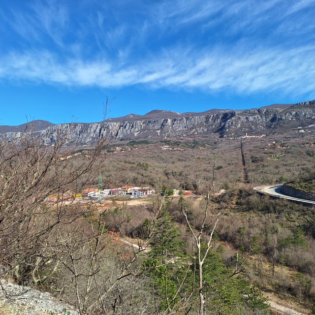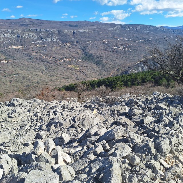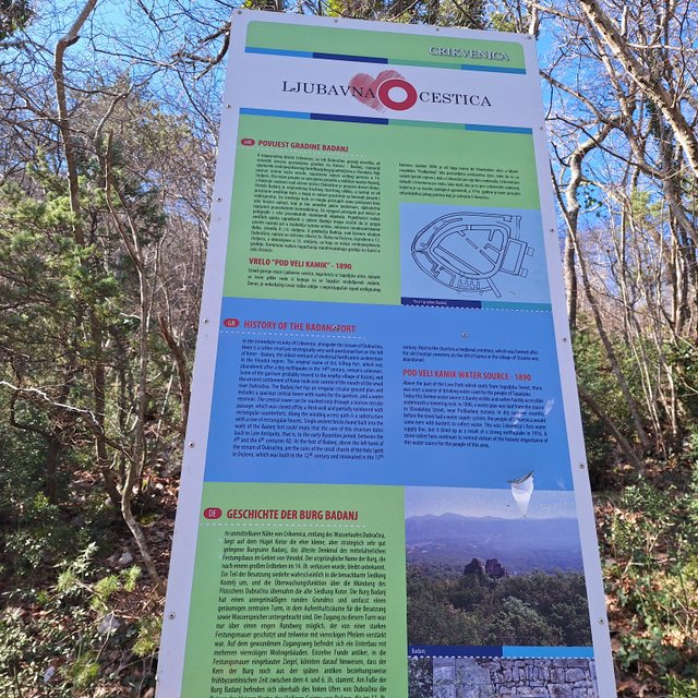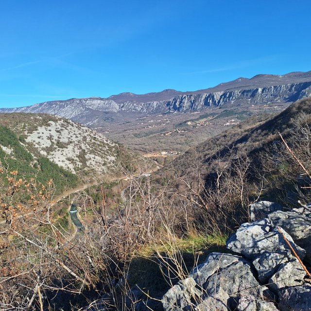 dolino in na drugi strani v hrib do gradu Badanj z lepim razgledom na naselje v dolini.