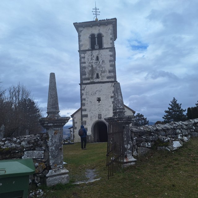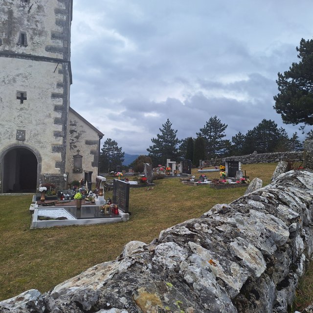 hribčku v bližini, okrog nje je pokopališče, med spomeniki pa namesto urejenih kamnitih